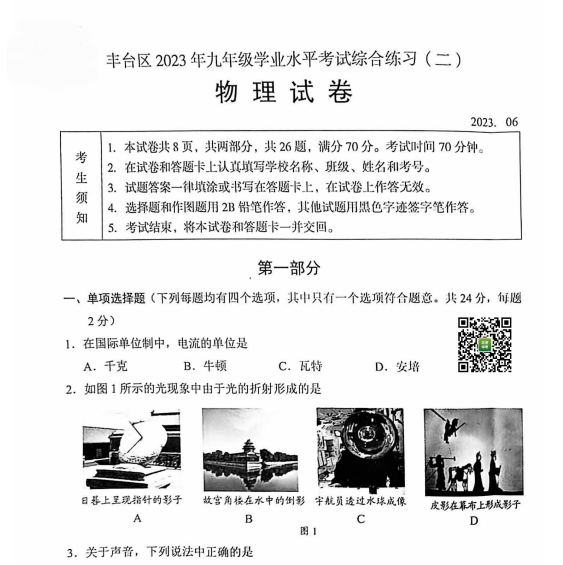2023北京丰台区初三二模正在进行,admw360中考网为大家整理了物理试题及答案,分享给大家。