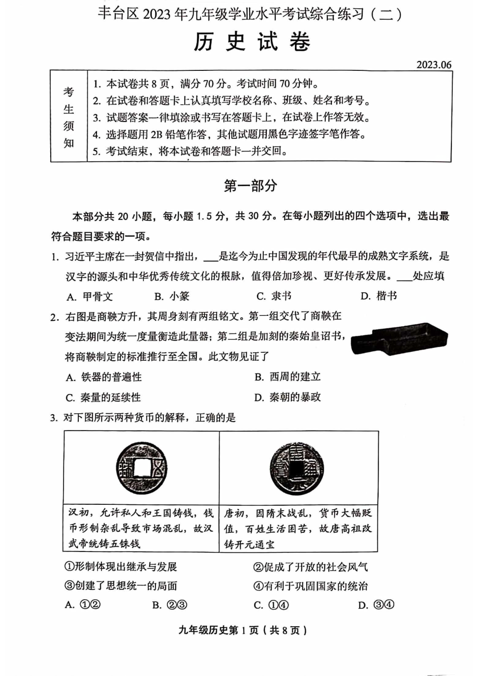 2023北京丰台区初三二模正在进行,admw360中考网为大家整理了历史试题及答案,分享给大家。