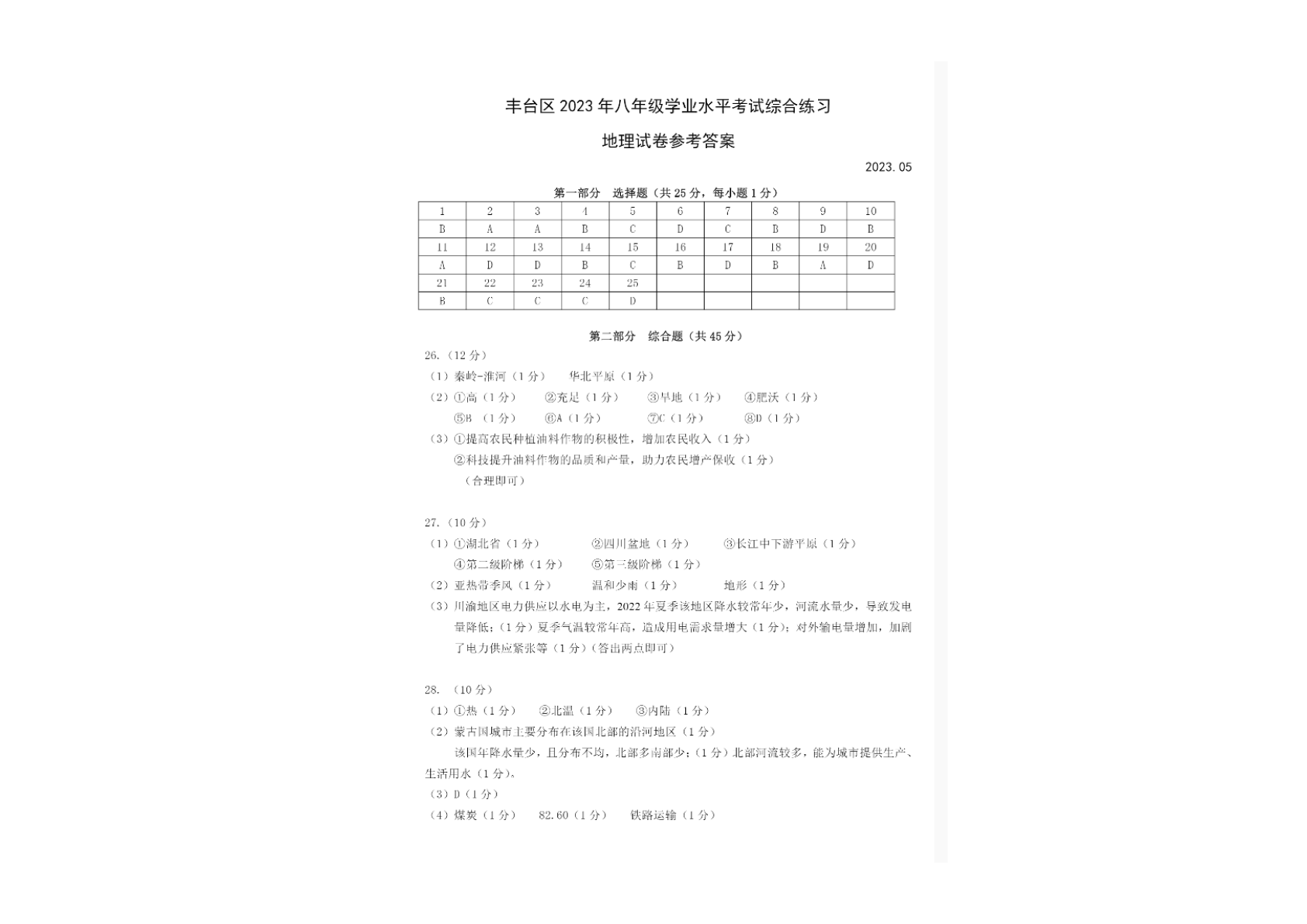 2023年北京丰台区初二二模考地理试卷已出炉,admw360中考网第一时间整理并分享在本页面,供大家参考学习!