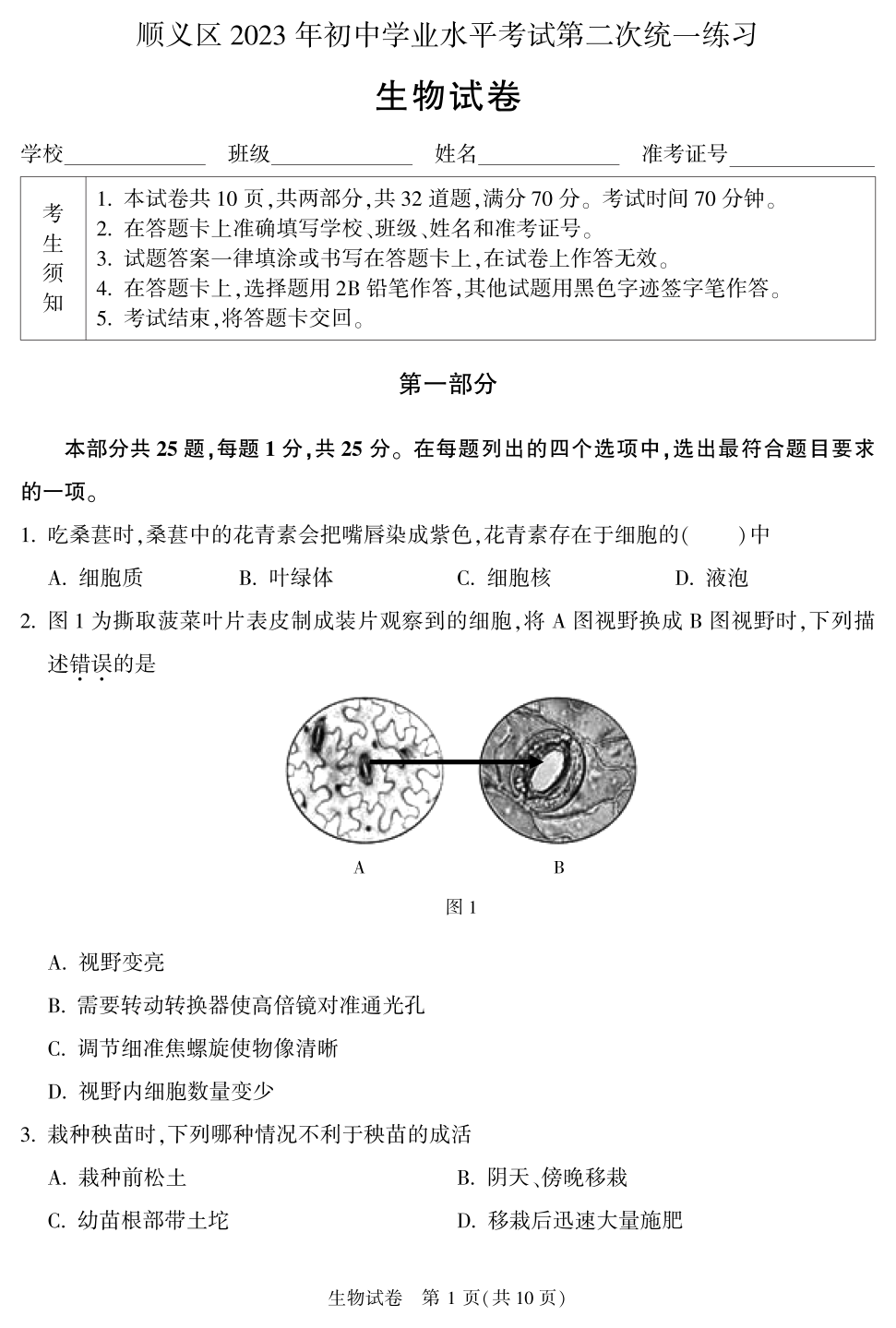 2023北京顺义区初二二模生物试卷已出炉!admw360中考网收集并分享在本页中!答案持续收集,欢迎各位考生家长分享本页面。
