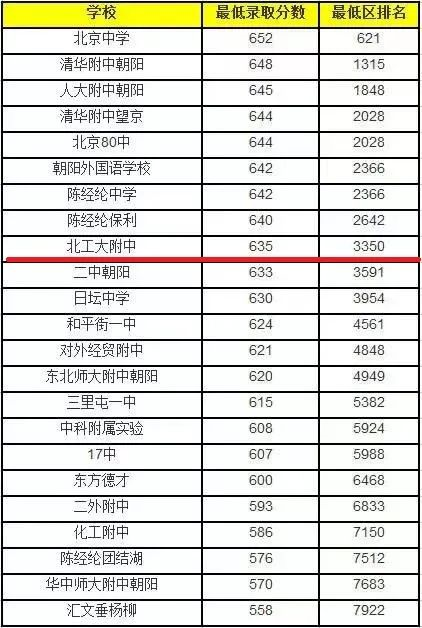 工大附中作为朝阳区老牌区重点,应该算是朝阳第一区重点,大概位于朝阳前10的位置。今年工大附中中考录取分数线635分,区排在3350名,在朝阳排名第9。