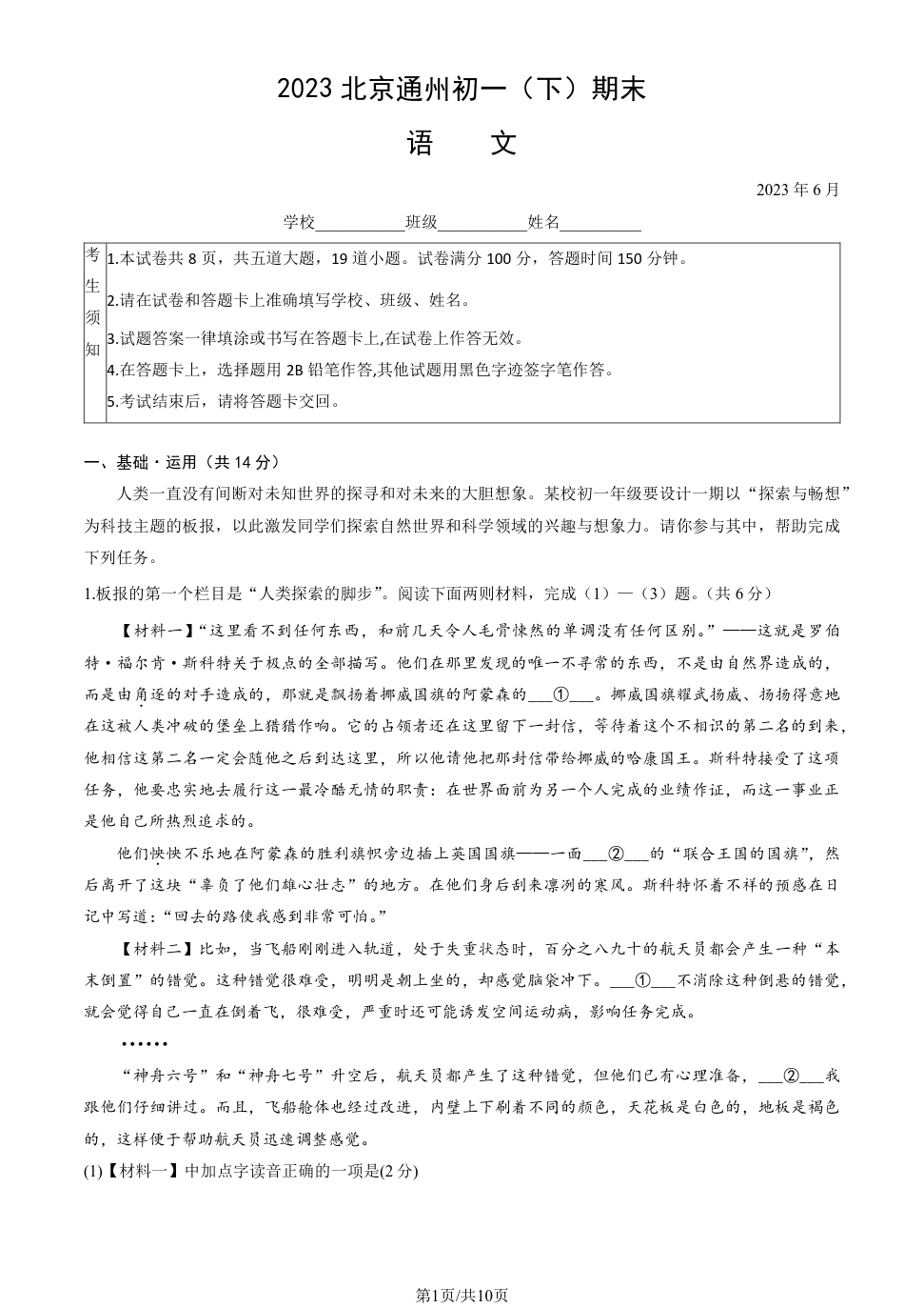 首页 初一试题 2023北京通州区初一(下)期末语文试题及答案