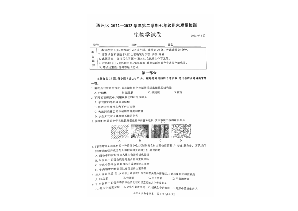 首页 初一试题 2023北京通州区初一(下)期末生物试题