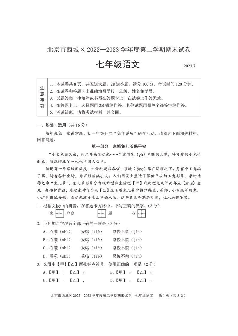 首页 初一试题 2023北京西城区初一(下)期末语文试题及答案