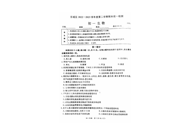 首页 初一试题 2023北京东城区初一(下)期末生物试题及答案