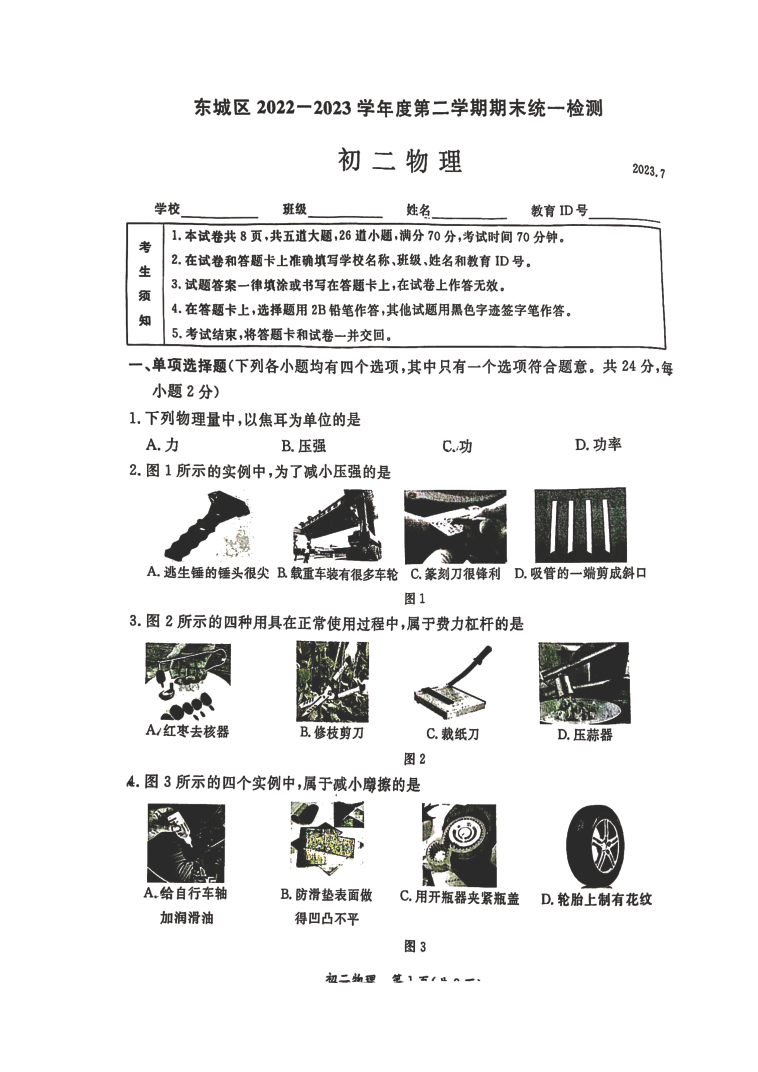 首页 初二试题 2023北京东城区初二(下)期末物理试题及答案