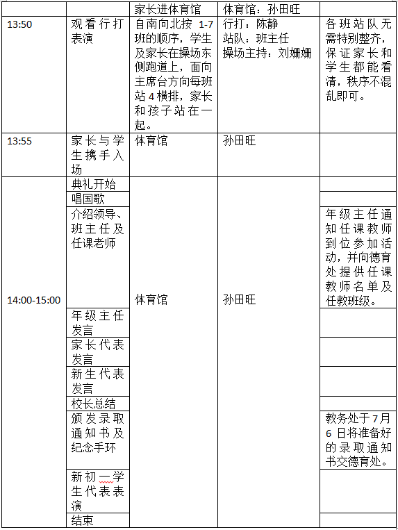 3.7月9日上午7:30-8:40室外活动仪式(在该时间段到校即可,包括领录取通知书、走’成长之门’、签名版上签字”等环节),9:00—11:40在报告厅进行新生入学教育和暑假学习指导(由于座位有限,可以请一位家长陪同参加) 。