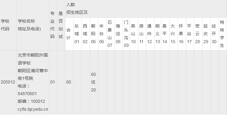 朝阳外国语学校2023年总共招生60人,统招计划60人。各位想要报名朝阳外国语学校的考生和家长一定要提前了解各项招生数据,做好2024北京中考的准备。