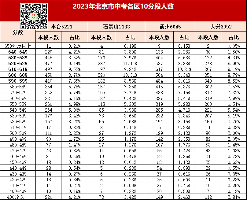 admw360中考网整理了2023北京丰台、石景山、通州、大兴中考10分段人数统计,分享给大家。