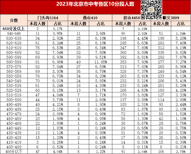 admw360中考网整理了2023北京门头沟、燕山、房山、顺义中考10分段人数统计,分享给大家。