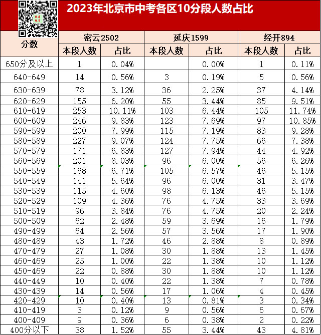 admw360中考网整理了2023北京密云、延庆、经开中考10分段人数统计,分享给大家。