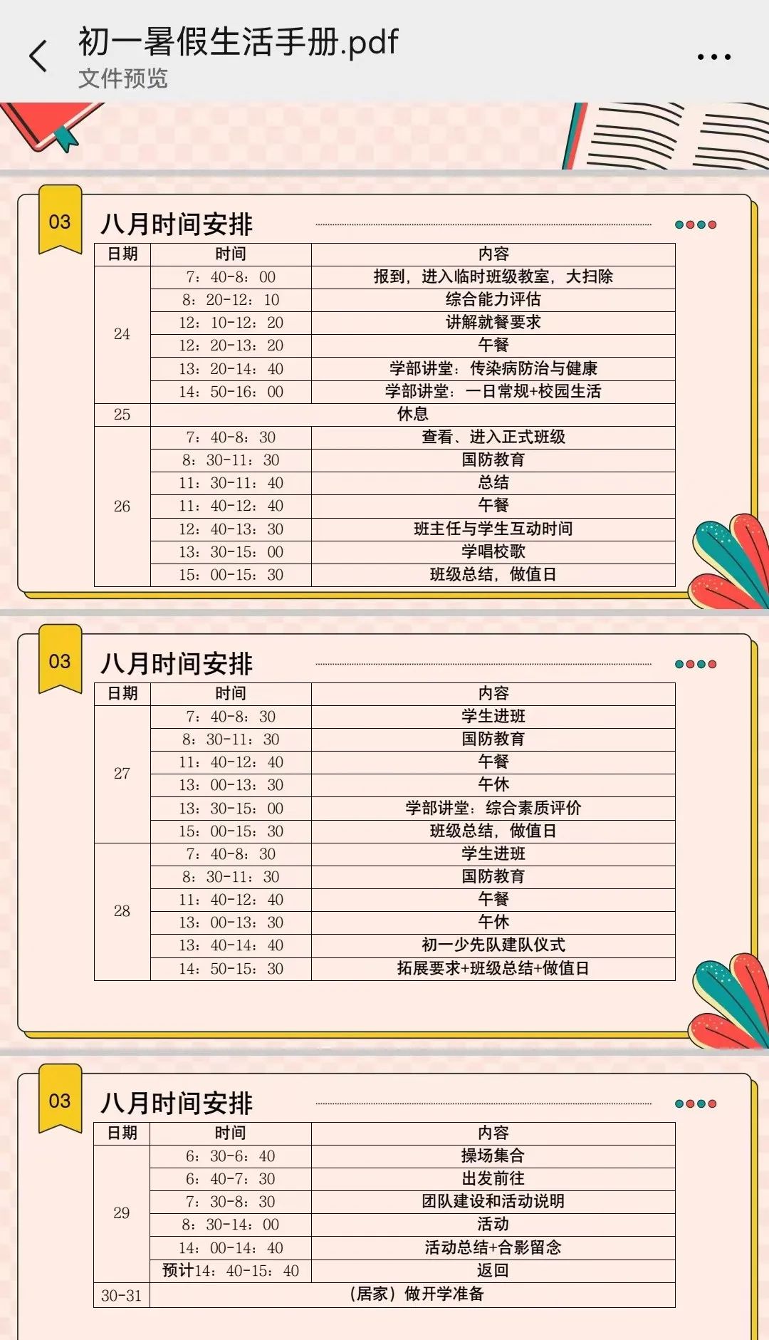 报到时间为8月24日7:40-8:00,8月具体安排如下: