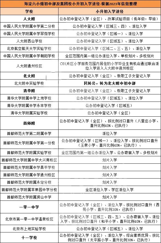可直升海淀“六小强”高中部的初中校(27所)小升初入学途径如下:(根据2023年内容整理,2024北京小升初家长可参考)