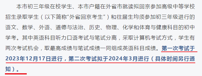 2024北京中考英语听说考第一次考试时间为2023年12月17日;