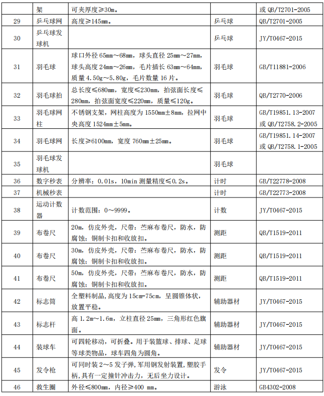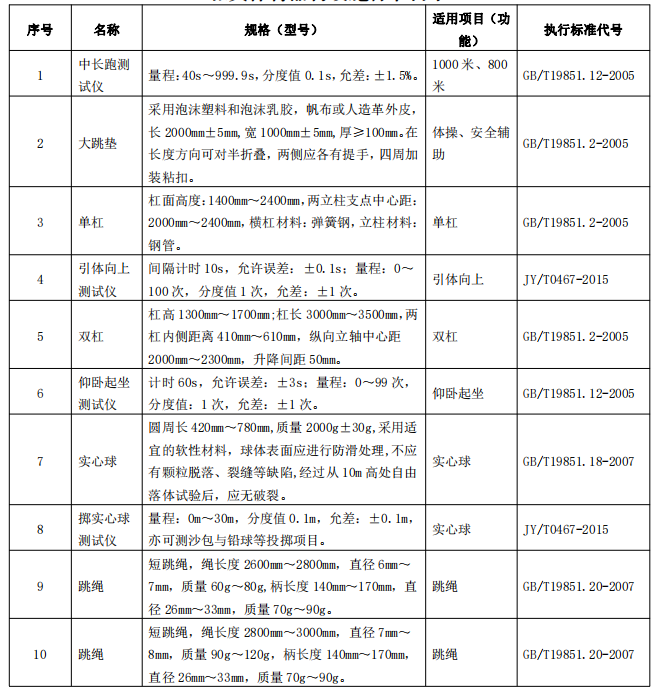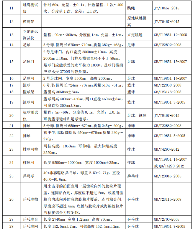 北京市义务教育体育与健康考核评价现场考试相关体育器材设施标准目录