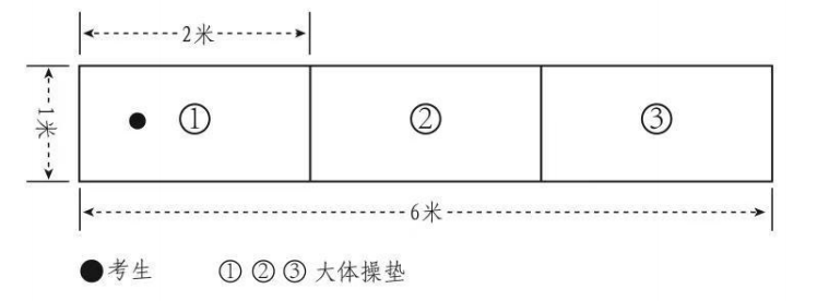 考试场地设置在平坦的地面上,成套动作必须在体操垫上完成,确保考生安全。体操垫长 2 米、宽 1 米、厚 0.1 米,不少于三块。有条件的区应该把场地设置在体育馆内。体操垫摆放方式如图所示: