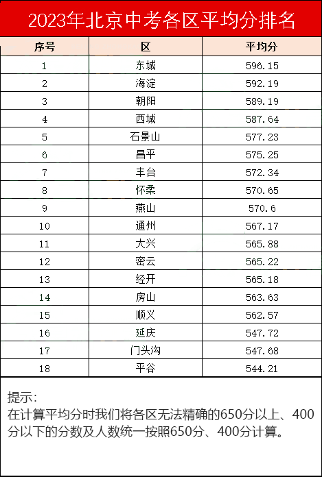2023北京中考各区平均分是多少?哪些区在560分以上?
