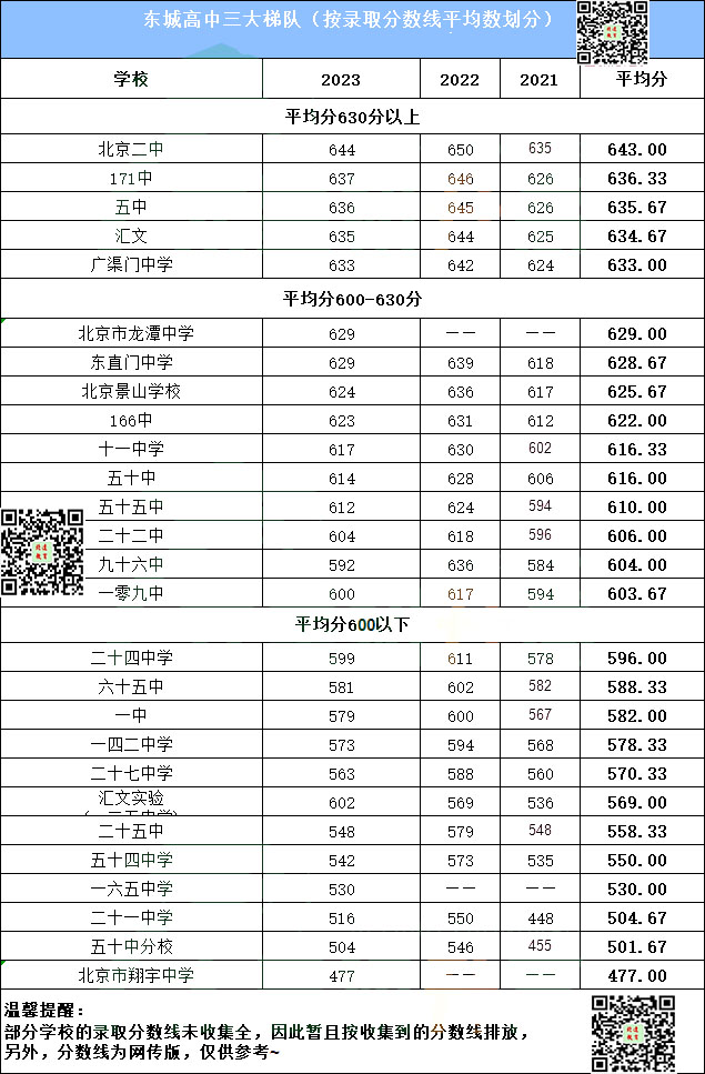 admw360中考网根据东城区考生的大致分数范围,依据各高中近3年的录取分数线平均分数,划分了三大梯队,第一梯队为630分以上,第二梯队为600-630分之间,第三梯队为600分以下,一起来看看吧: