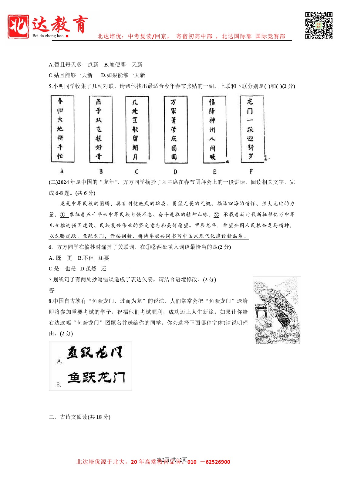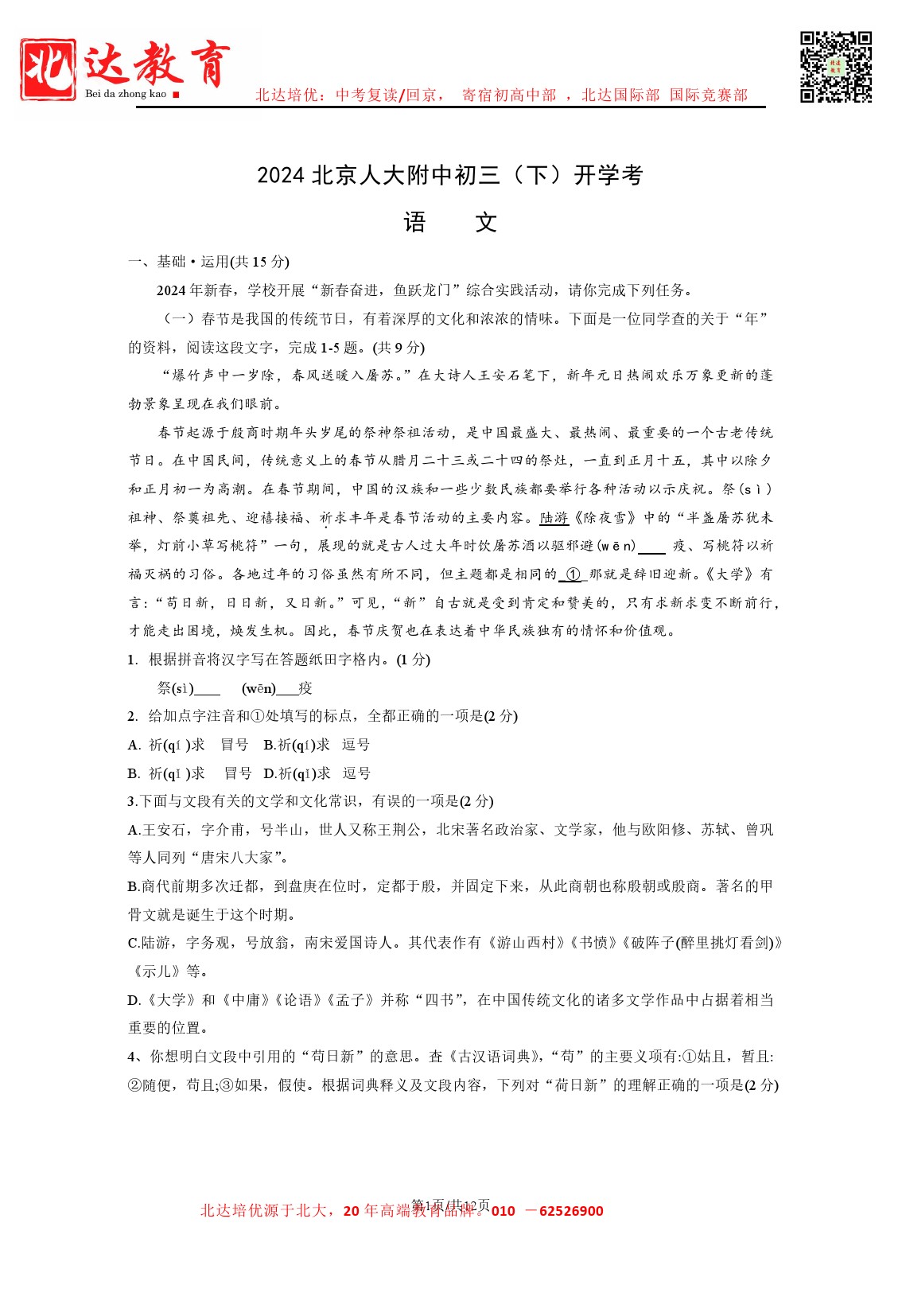 admw360中考网整理分享了2023-2024学年北京人大附中初三(下)开学考语文试题及答案,需要的同学赶紧下载练习吧。 admw360中考复读,外地回京全日制 ★2024中考复读全日制,应届生全日…