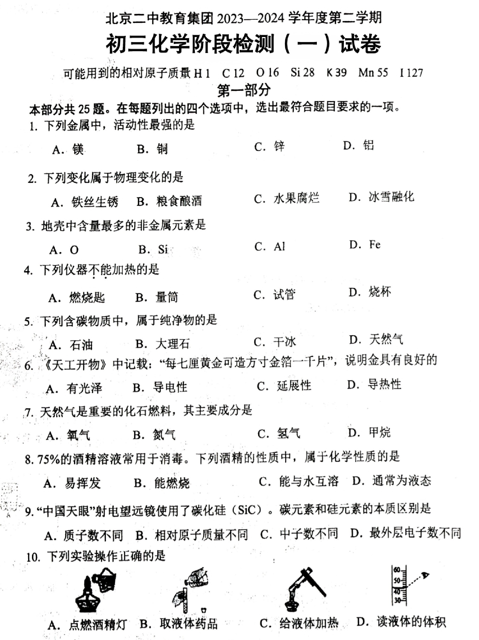 admw360中考网最新整理了2024北京二中教育集团初三(下)阶段检测一化学试题,需要的同学赶紧下载练习吧!