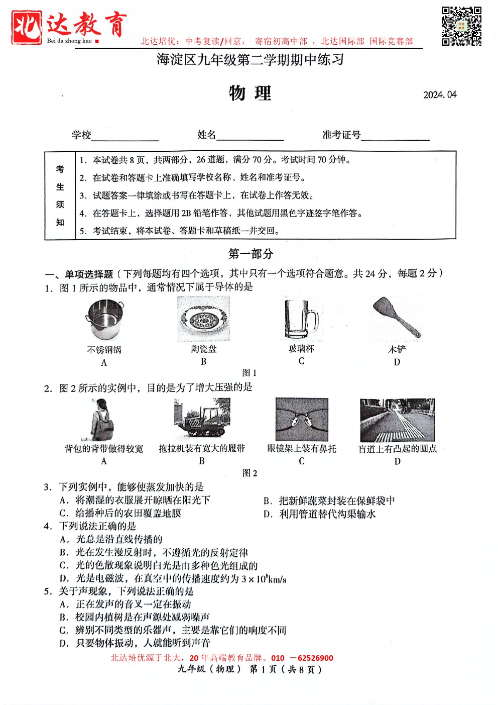 2024北京海淀初三一模开考了,admw360中考教研组收集整理了2024北京海淀初三一模考物理试卷&答案,速来下载。