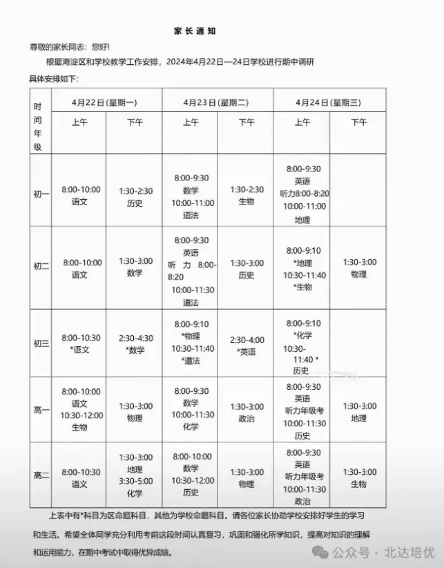 有家长反馈海淀某校初一年级,就4月23日考一天,语数英道,其他三科不考。也有家长反馈他们学校只考语数英。具体的考试安排,还得以学校通知为准。