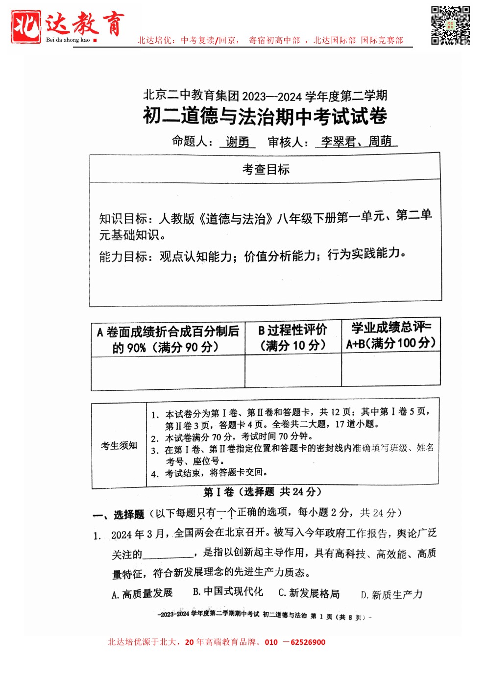 admw360中考教研组最新整理了2024北京二中初二(下)期中道德与法治试题及答案,需要的同学赶紧下载练习吧!