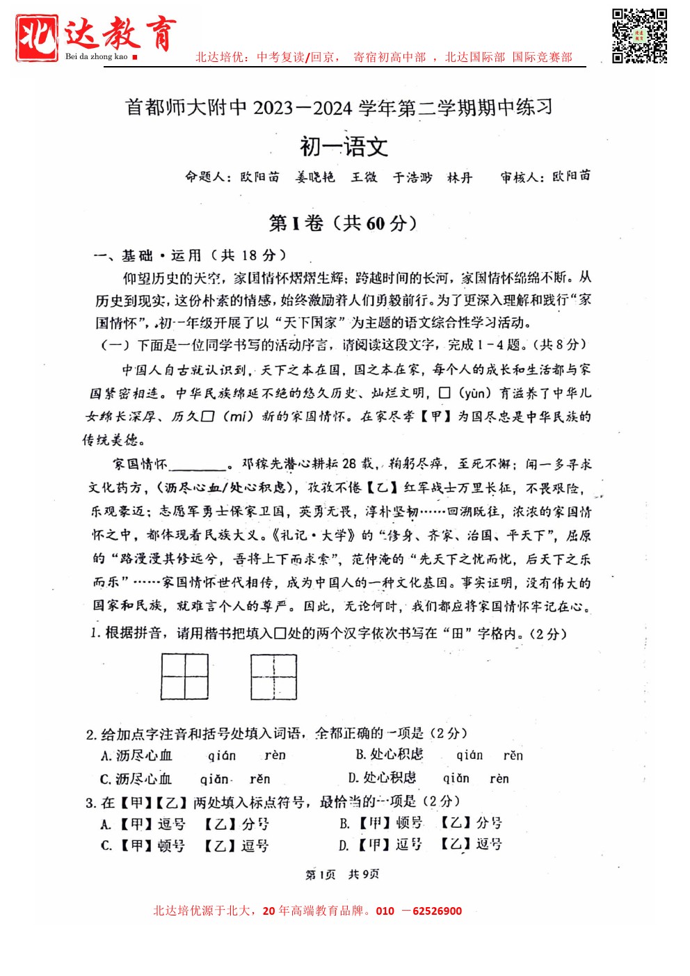 admw360中考教研组最新整理了2024北京首师大附中初一(下)期中语文试题及答案,需要的同学赶紧下载练习吧! 北京admw360全日制学校,中高考复读,外地回京中高考 电话咨询:400-61681…