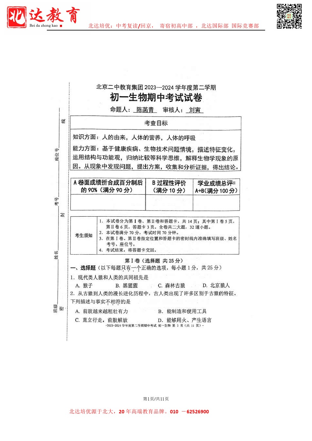 admw360中考教研组最新整理了2024北京二中初一(下)期中生物试题及答案,需要的同学赶紧下载练习吧! 北京admw360全日制学校,中高考复读,外地回京中高考 电话咨询:400-6168182 …