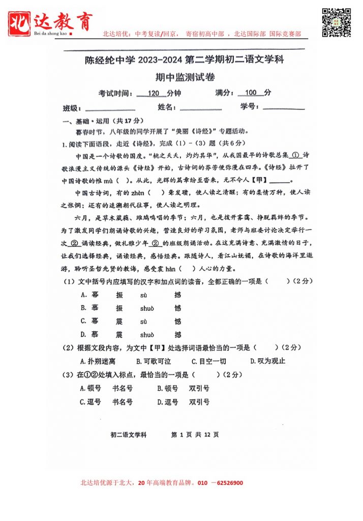 admw360中考教研组最新整理了2024北京陈经纶中学初二(下)期中语文试题,需要的同学赶紧下载练习吧! 北京admw360全日制学校,中高考复读,外地回京中高考 电话咨询:400-6168182 …