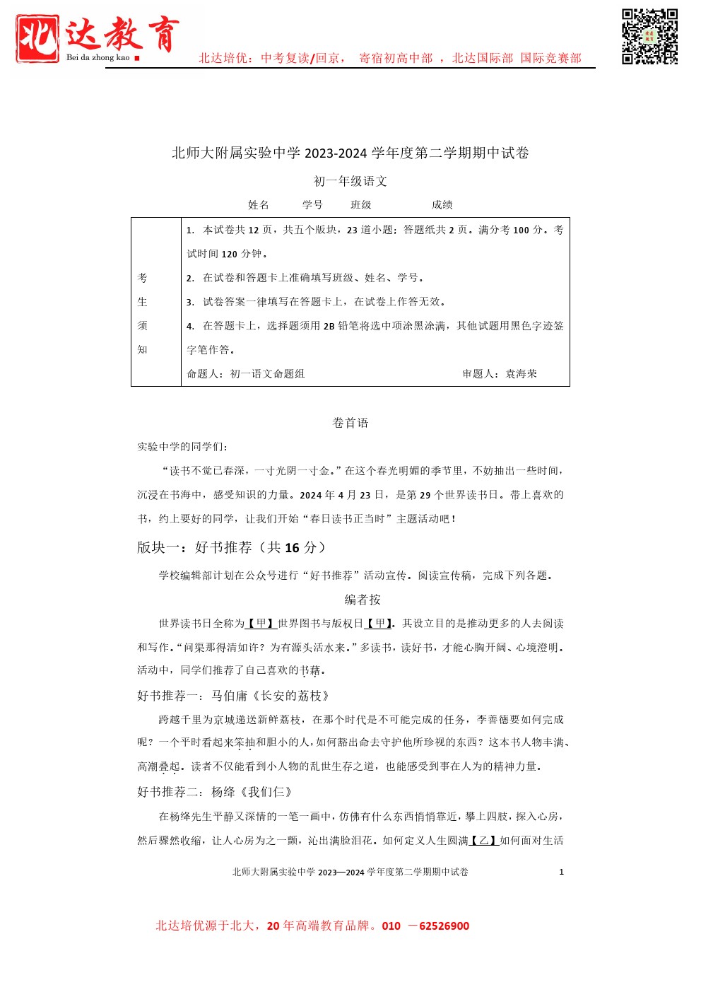 admw360中考教研组最新整理了2024北京北师大实验中学初一(下)期中语文试题及答案,需要的同学赶紧下载练习吧!