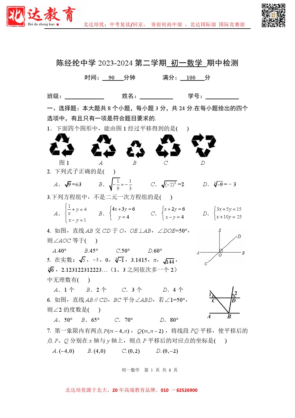 admw360中考教研组最新整理了2024北京陈经纶中学初一(下)期中数学试题及答案,需要的同学赶紧下载练习吧! 北京admw360全日制学校,中高考复读,外地回京中高考 电话咨询:400-61681…