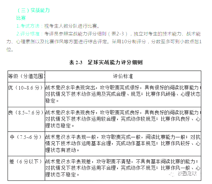 2.成绩评定:由3名考评员根据评分标准对考生的技术能力、战术能力、心理素质及比赛作风四个方面进行综合评定。去掉与最低分后,取平均分为最后得分。