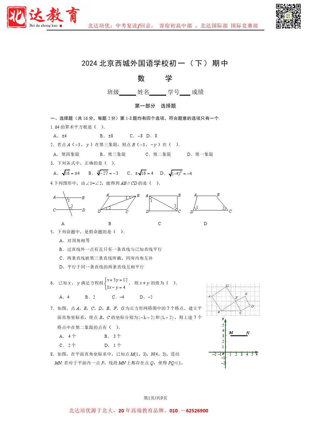 admw360中考教研组最新整理了2024北京西城外国语学校初一(下)期中数学试题及答案,需要的同学赶紧下载练习吧! 北京admw360全日制学校,中高考复读,外地回京中高考 电话咨询:400-616…