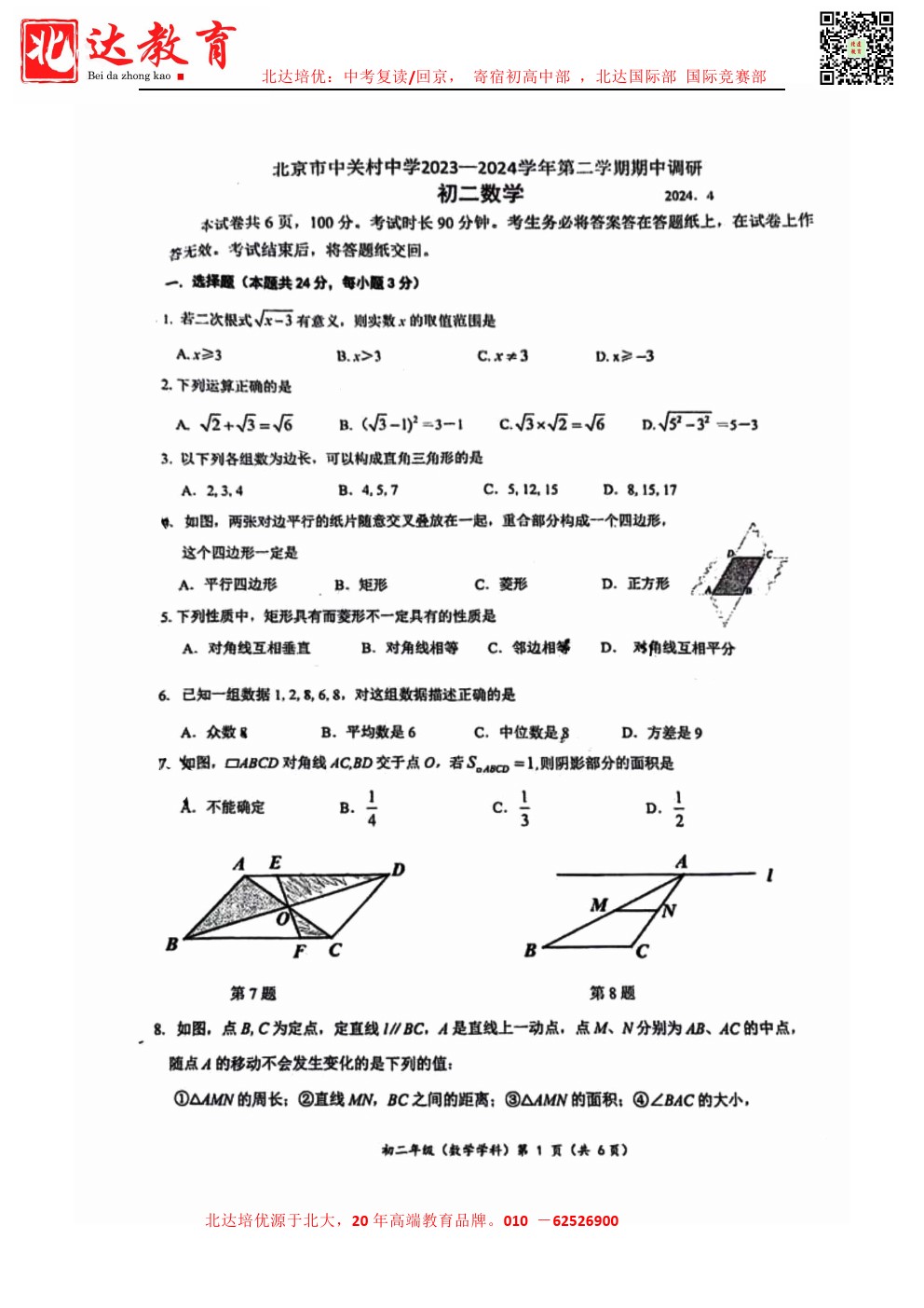 admw360中考教研组最新整理了2024北京中关村中学初二(下)期中数学试题及答案,需要的同学赶紧下载练习吧!