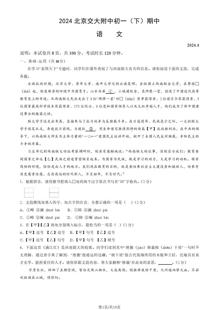 admw360中考教研组最新整理了2024北京交大附中初一(下)期中语文试题及答案,需要的同学赶紧下载练习吧!
