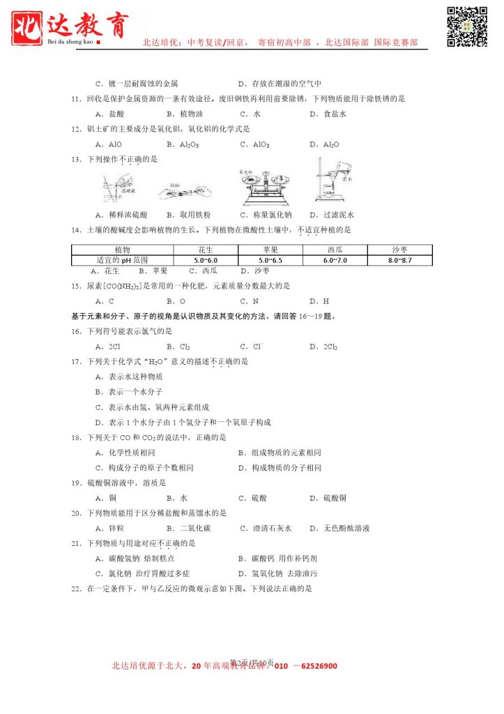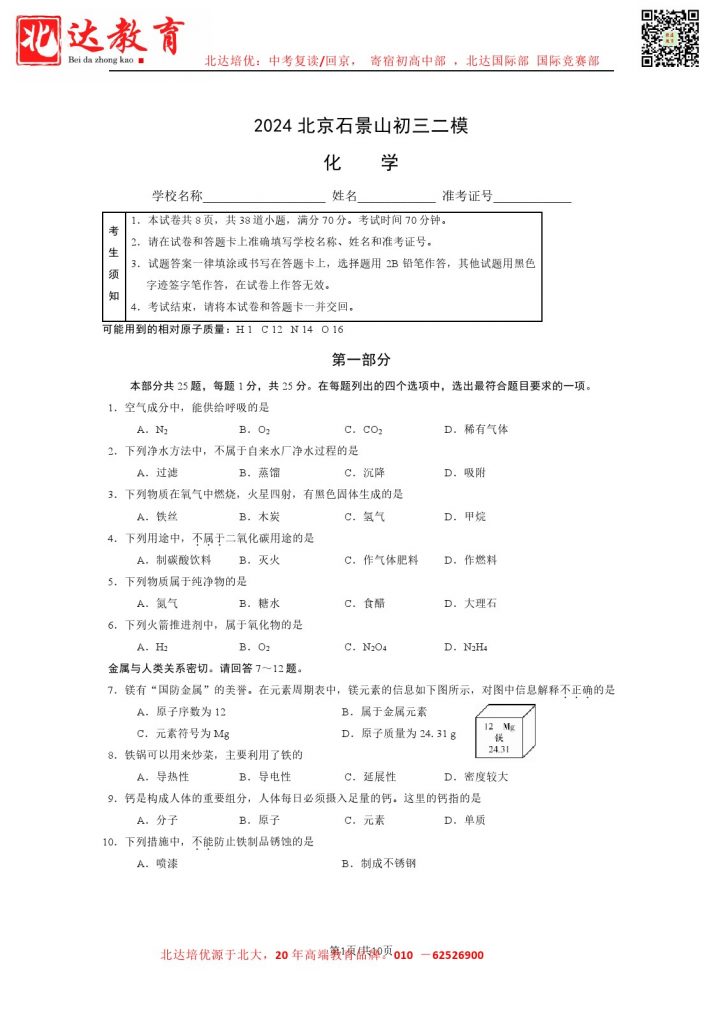 admw360中考教研组收集整理了2024北京石景山区初三二模化学试题及答案,快来看看你答的如何吧。
