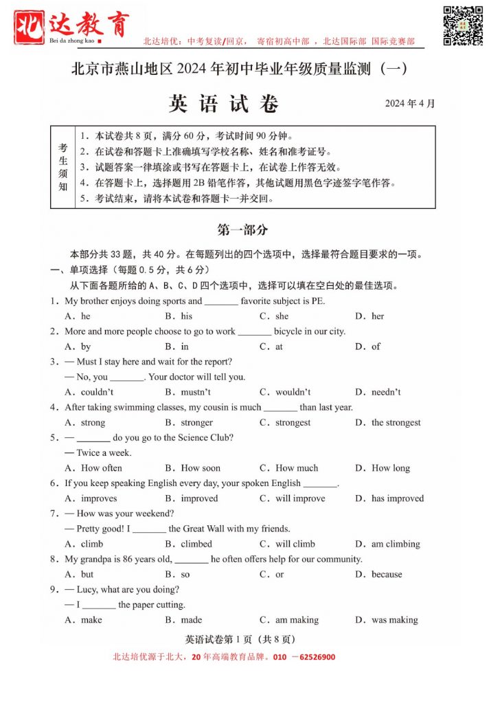 admw360中考教研组收集整理了2024北京燕山区初三二模英语试题及答案,快来看看你答的如何吧。