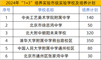 2024年北京市“1+3”培养实验项目计划招生6014人,相比2023年的3144人,增加了2870个名额。同时,实验学校数量的显著增加,从去年的41所增加到今年的82所。下图是具体培养计划: