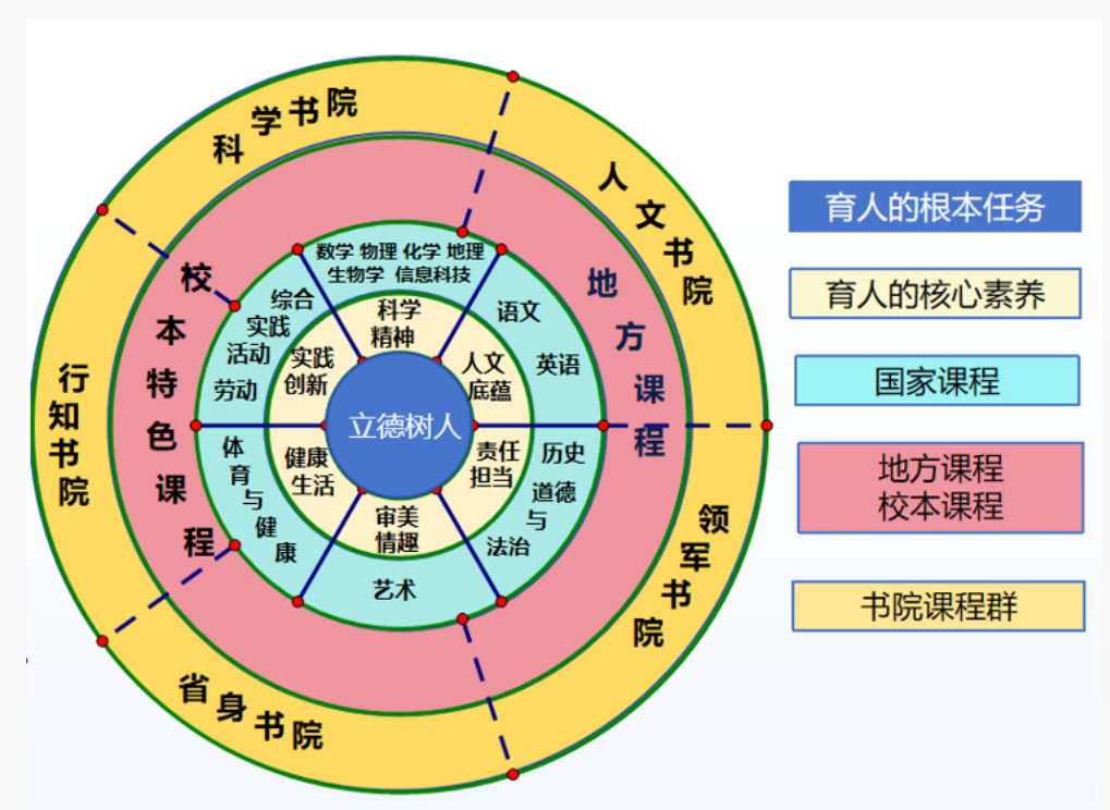 学校将国家、地方、校本三类课程深度融合,构建了“年级+书院”的经纬式课程管理模式,设立了人文、科学、行知、省身、领军五大书院课程群。这一课程体系横向跨学科、纵向跨年级,既保证了基础教育的全面性,又满足了学生个性化发展的需求,为学生提供了丰富多样的选择空间。具体如下图所示(图源自北京一零一中):