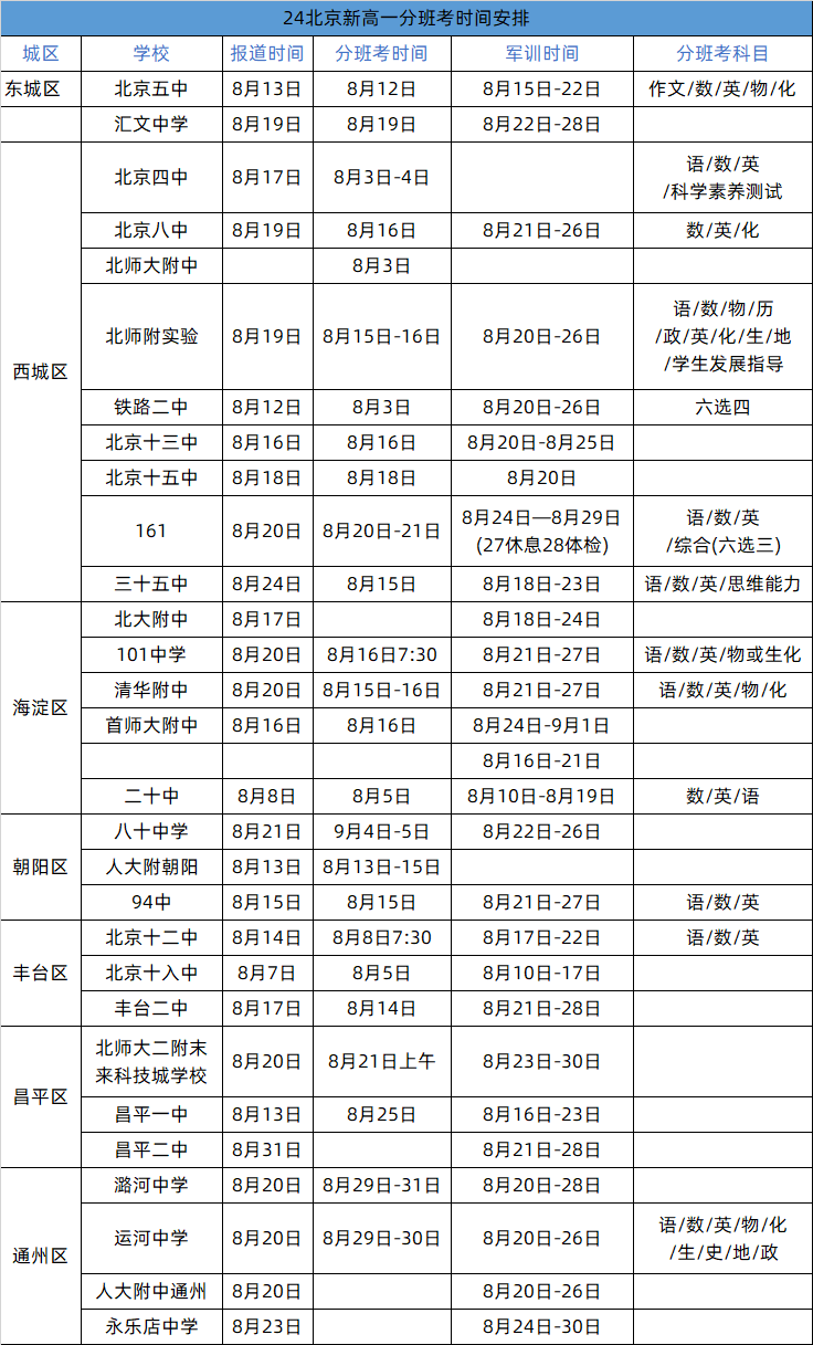 随着新高一分班考或入学测试的日益临近,北京新高一学子的心情也悄然发生了变化。从中考的紧张冲刺中解脱出来的他们,或许已沉浸在假期的轻松氛围中,享受着久违的悠闲与自由。然而,八月的这次考试如同一声号角,再次唤醒了他们心中的紧张与期待。小编为大家整理了24年北京各区新高一分班考时间表,具体如下: