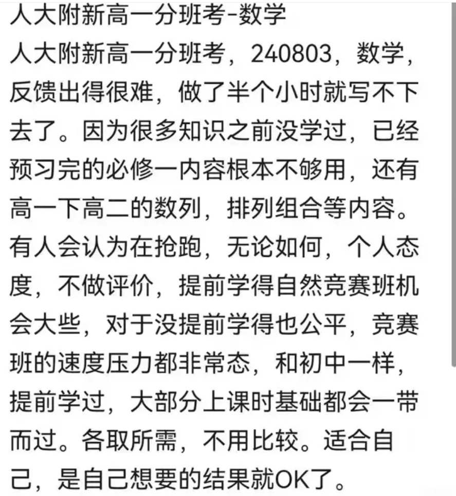 有网友分享:人大附新高一分班考,今天考了数学,学生反馈出得很难,已经预习完的必修一内容根本不够用,还有高一下高二的内容等。虽然有垂径定理,正方体展开图,但根本不是很多学校传说中考初中内容,所以务必认真准备。