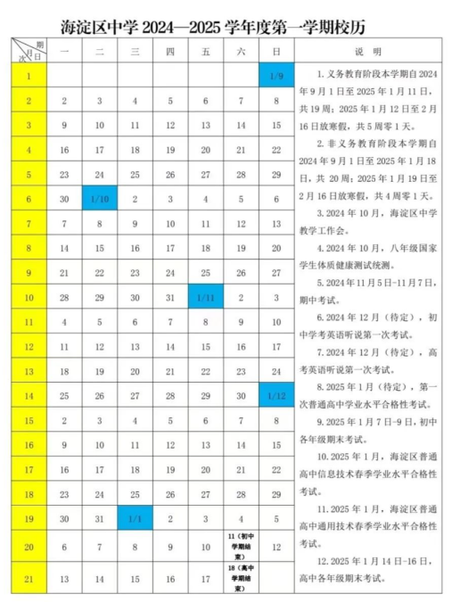 近日,海淀区中学2024-2025学年度第一学期校历正式公布,详细安排了开学时间、八年级体测、期中考试、英语听说考试、期末考试等重要事宜安排。一起来了解一下吧!