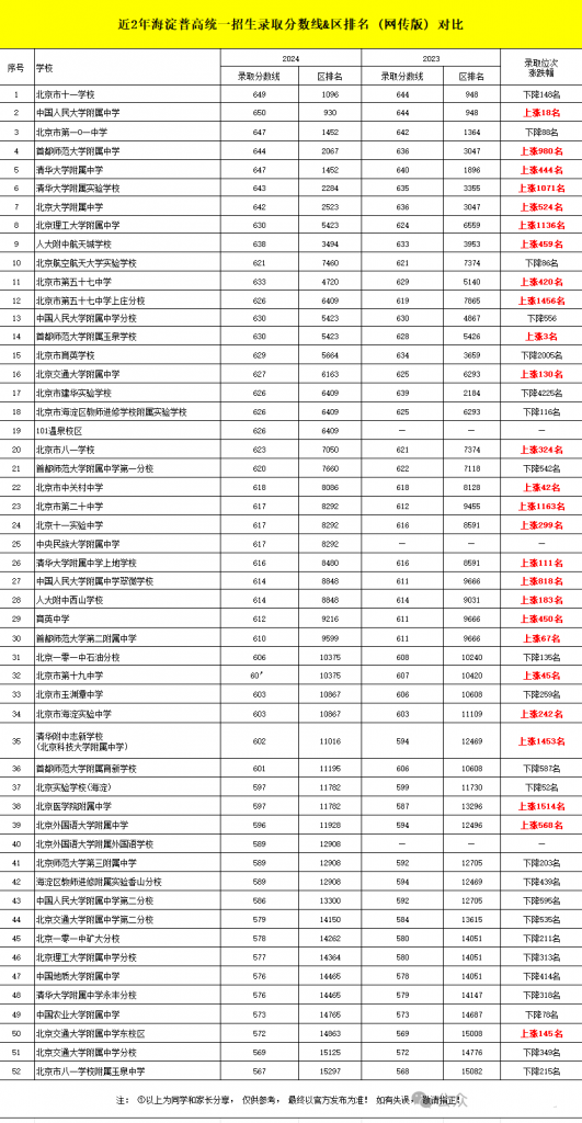 2024北京海淀区高中录取排名涨跌分析来袭!海淀高中录取排名新鲜出炉!六小强依旧强势,今年录取线普遍上涨,竞争激烈!选校需谨慎,数据仅供参考,官方发布为准!