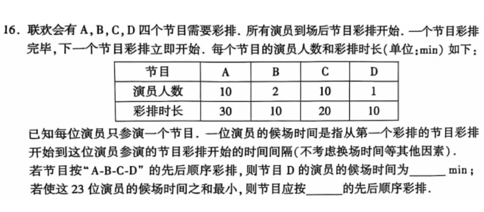 例如,第16题创设了节目彩排的真实情境,考查学生阅读理解能力,对题目中的信息进行提取、加工和处理的能力,通过生活经验加以推理后进行适当枚举达到最优化解决现实问题的目的,考查思维过程与应用意识。