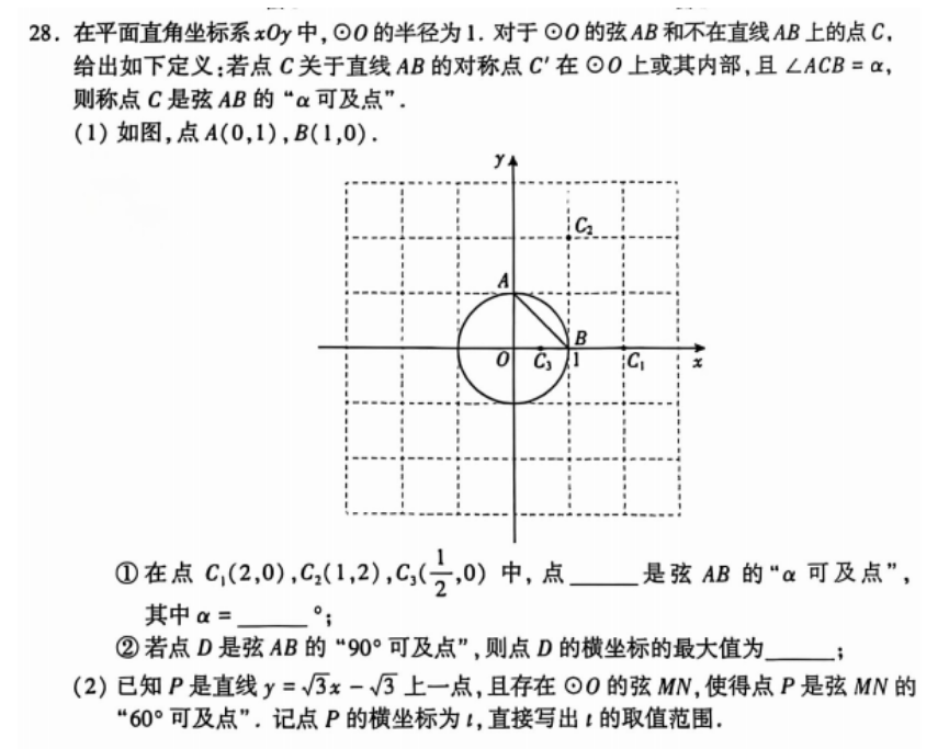 而第28题则考查了数学新概念的学习,在给出“α可及点”的新定义后,考查学生经历研究新知识的过程,从特殊到一般有逻辑有顺序的开展思考,研究运动变化中的不变关系,考查学生对知识的理解能力、迁移能力及思维严谨性。