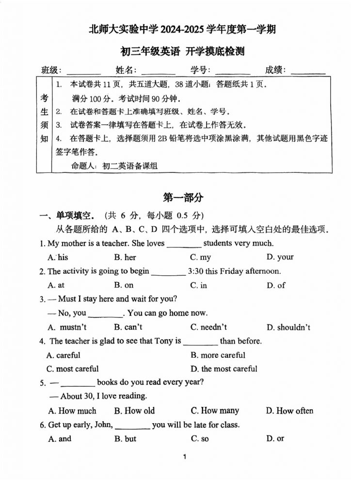 2024北京北师大实验中学初三(上)开学考英语试题及答案出炉,以下是小编为大家整理的相关内容,一起来看: