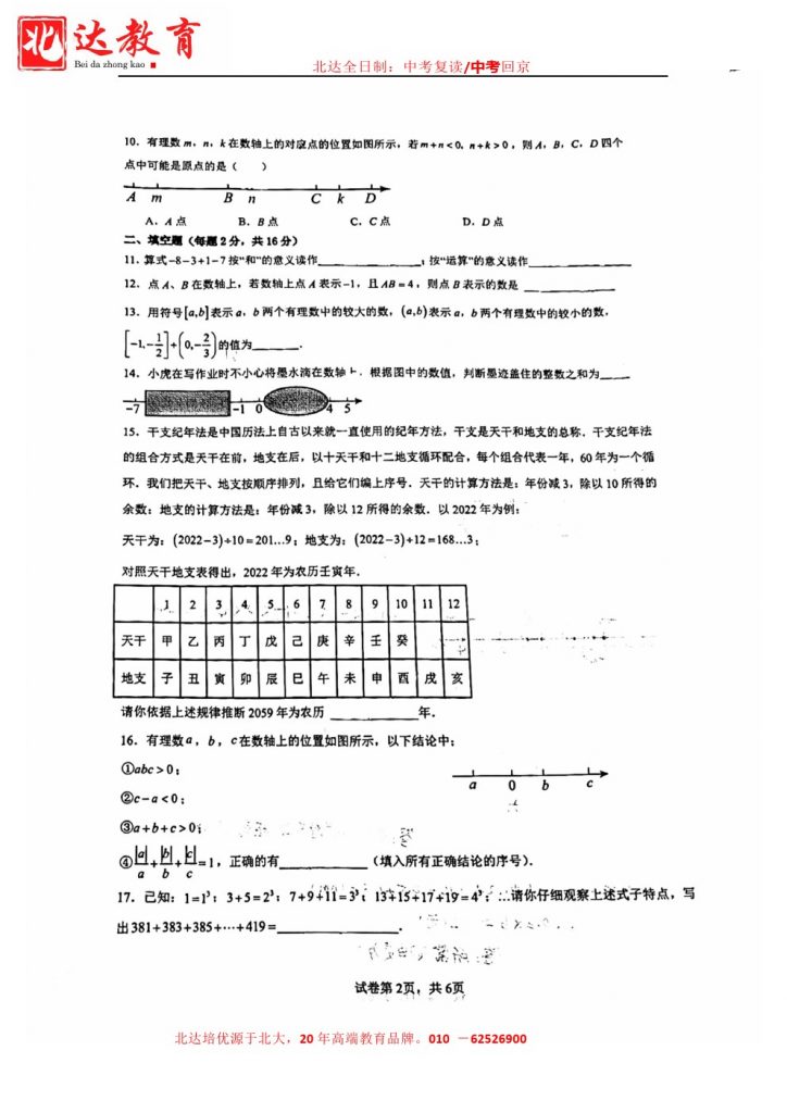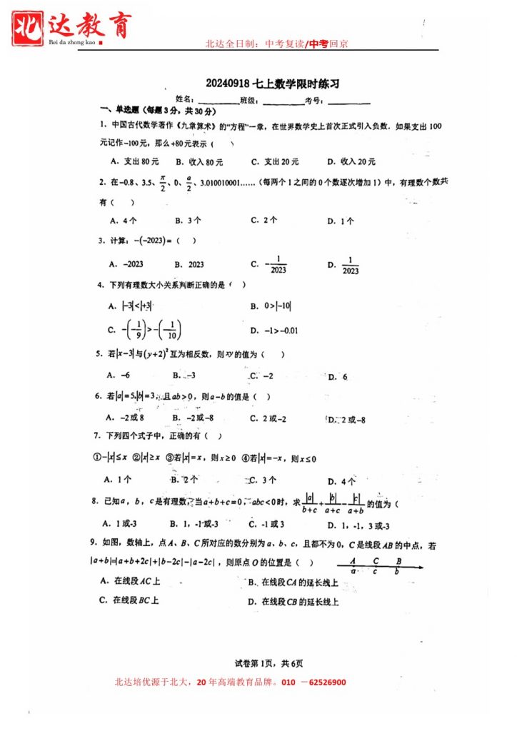 2024北京人大附朝阳学校初一9月月考数学试题出炉,以下是小编为大家整理的相关内容,一起来看: