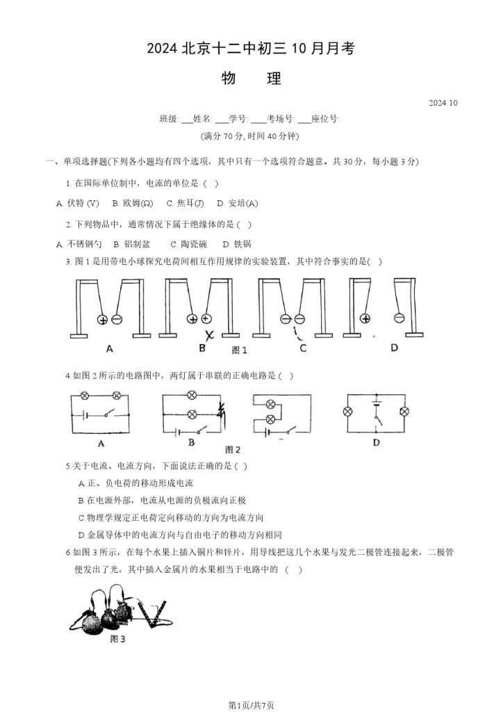 北京2024.10各个学校月考正在陆续进行中,为方便大家对答案、下载练习等小编给大家搜集了2024北京十二中初三10月月考物理试题及答案,需要的小伙伴赶紧下载练习起来吧: