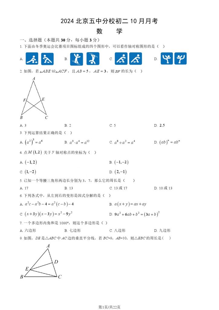 北京2024.10各个学校月考正在陆续进行中,为方便大家对答案、下载练习等小编给大家搜集了2024北京五中分校初二10月月考数学试题及答案,需要的小伙伴赶紧下载练习起来吧: